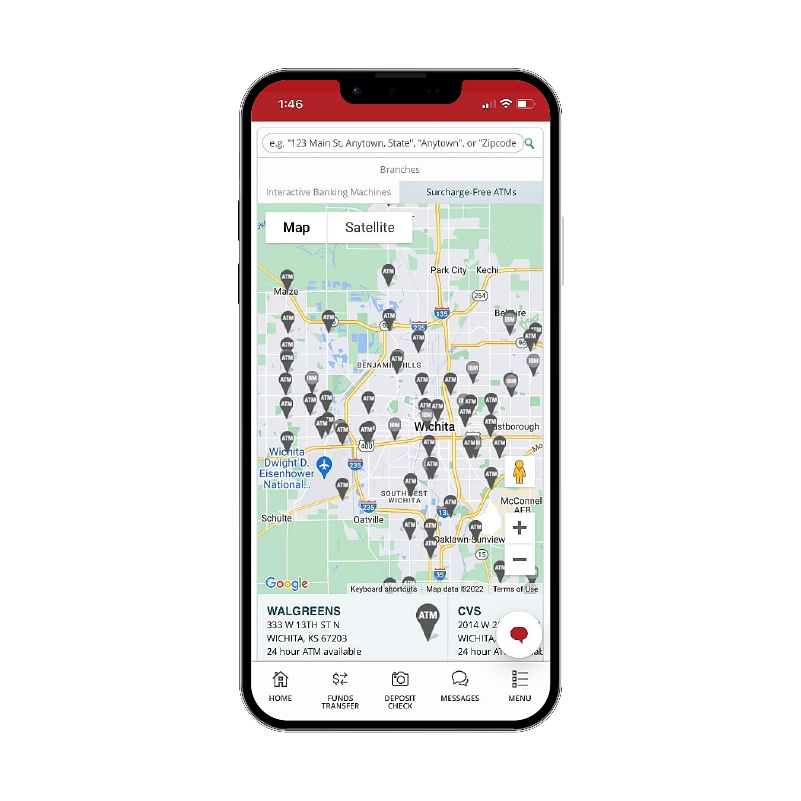 Simply select Locations from the main menu in online banking or the mobile app to find the best banking option. You can sort nearby locations by branches, Interactive Banking Machines and Surcharge-Free ATMs and select a pin to get more information and directions.